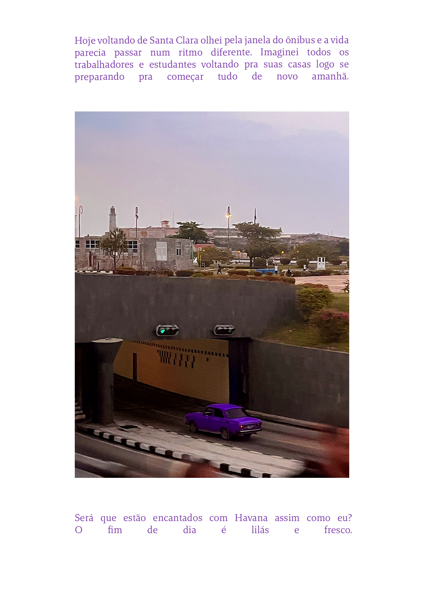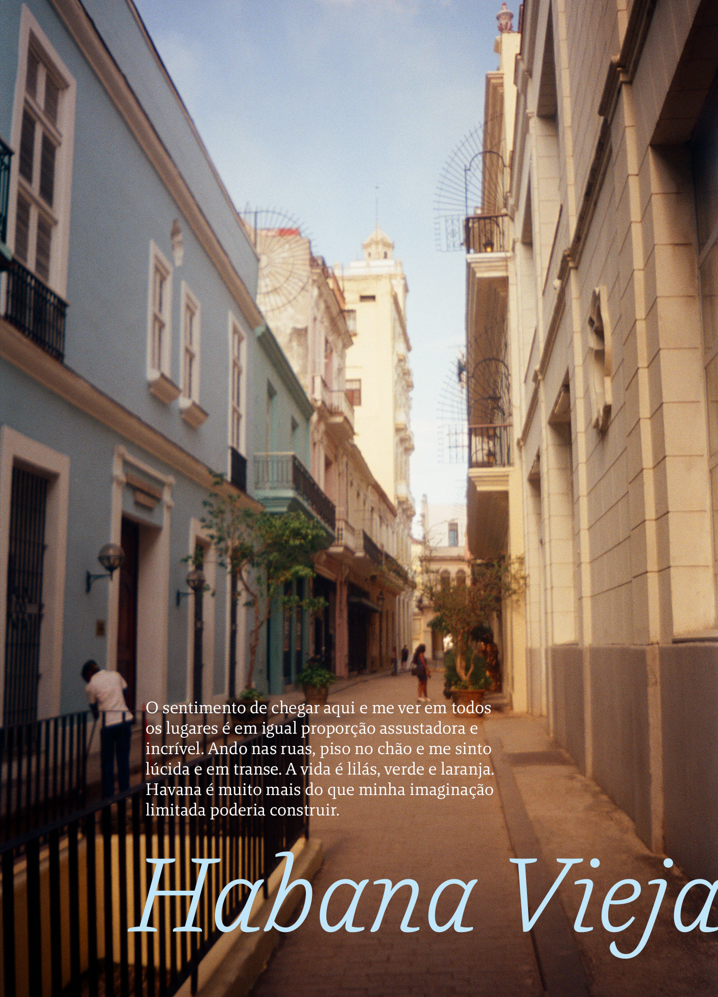 "O sentimento de chegar aqui e me ver em todos os lugares é em igual proporção assustador e incrível. Ando nas ruas, piso no chão e me sinto lúcida e em transe. A vida é quente e sopra meu rosto em lilás, verde e laranja. Havana é linda e muito mais do que minha imaginação limitada poderia construir."