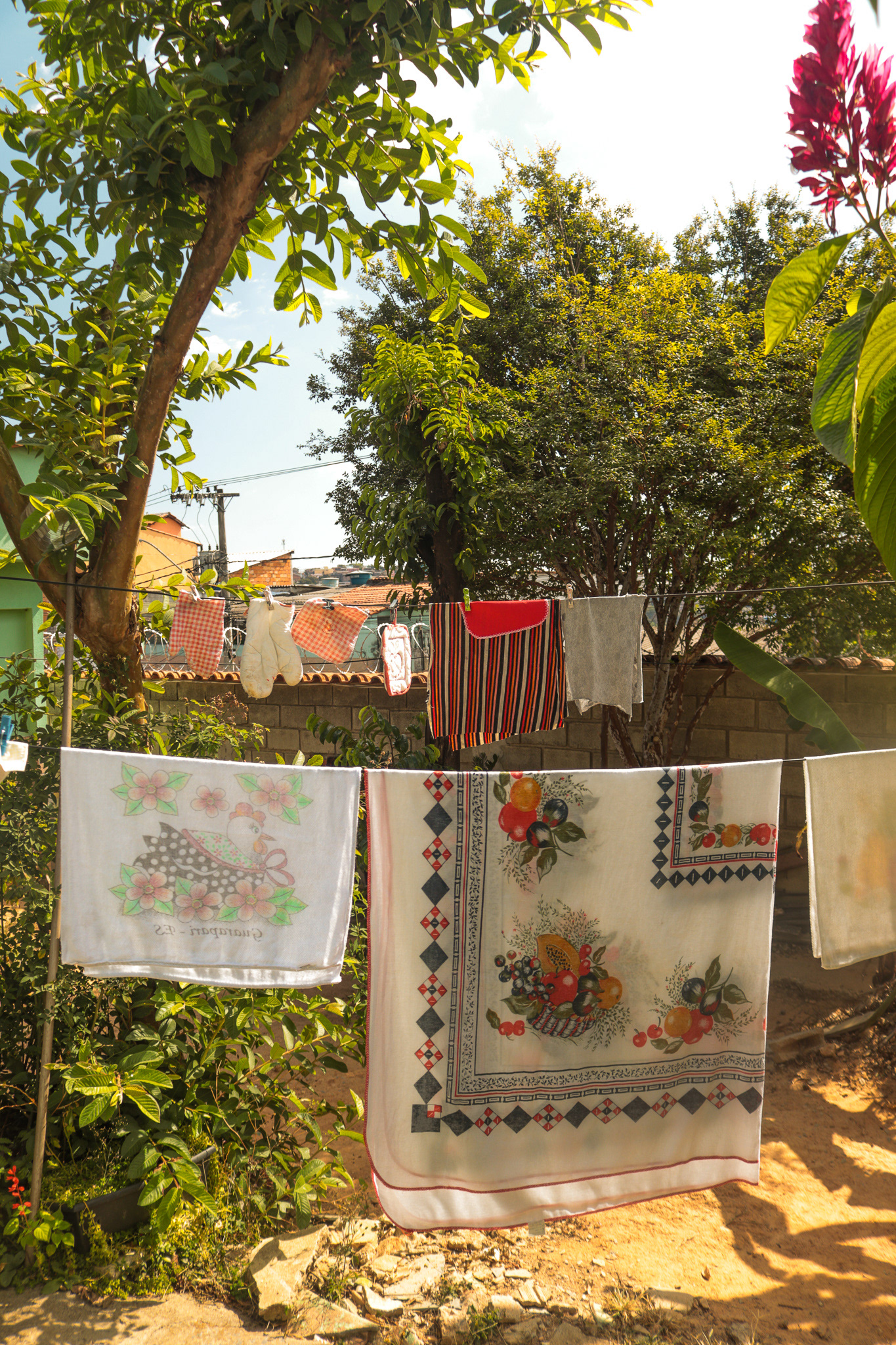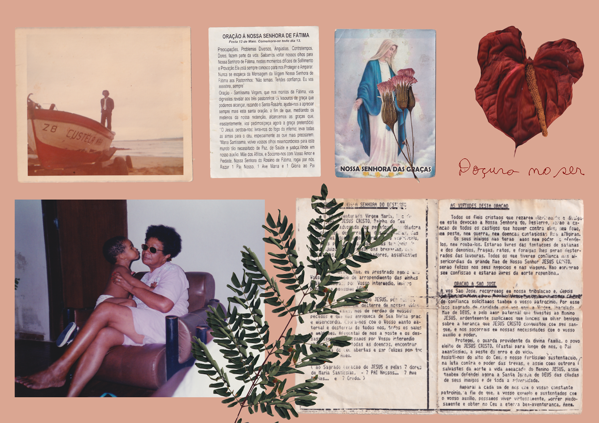 Foram usadas sua caligrafia, as folhas e flores de seu quintal, folhetos com rezas,