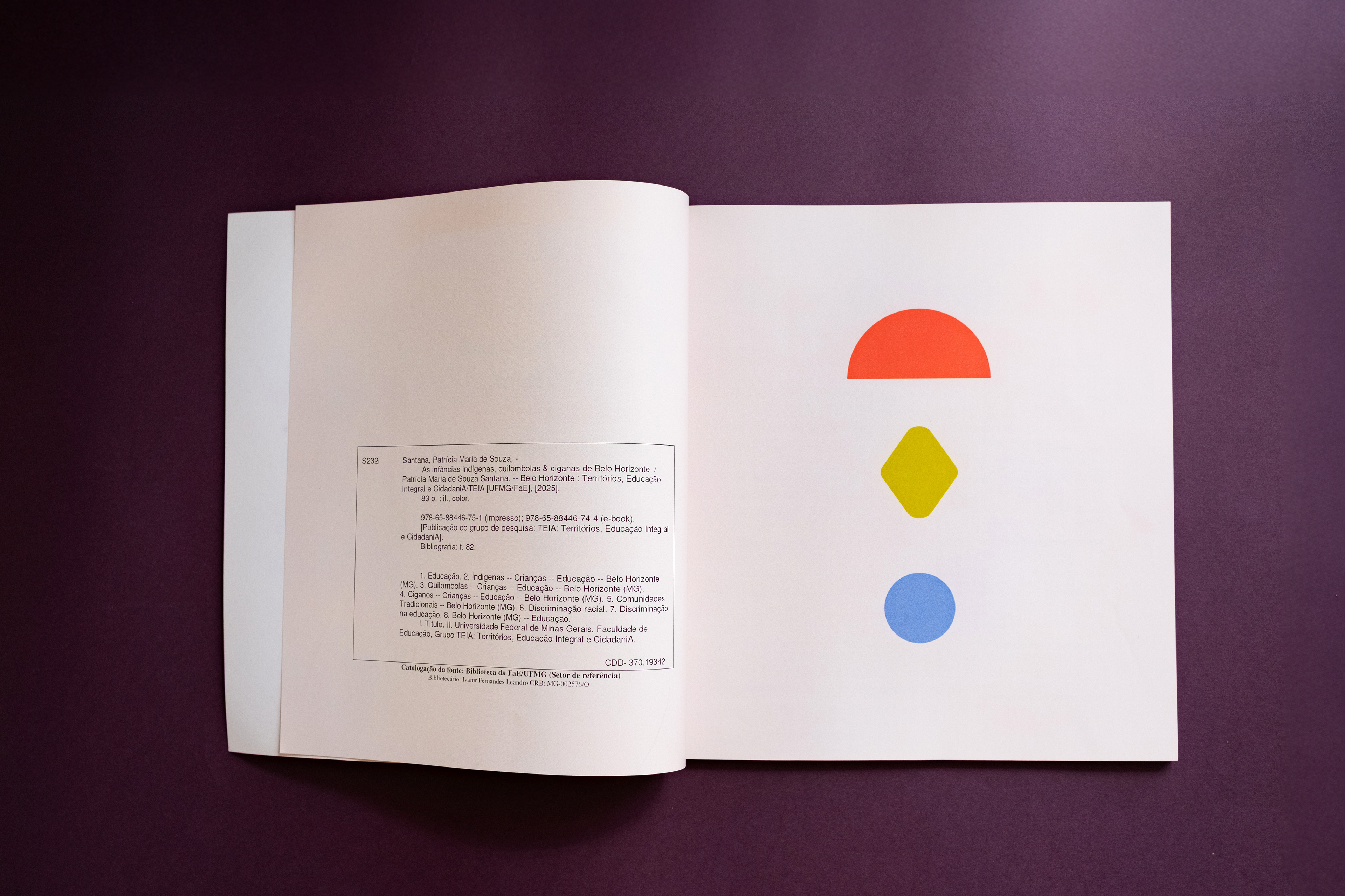 O caminho escolhido foi criar um sistema visual com formas geométricas e cores específicas para identificar cada povo. Meia lua e vermelho para as crianças quilombolas, losango e verde para as crianças indígenas e círculo e azul para as crianças ciganas. Cada forma conversa diretamente com o grafismo presente no universo visual de cada uma das comunidades e ajuda na navegação e reconhecimento de cada povo ao longo do livro.