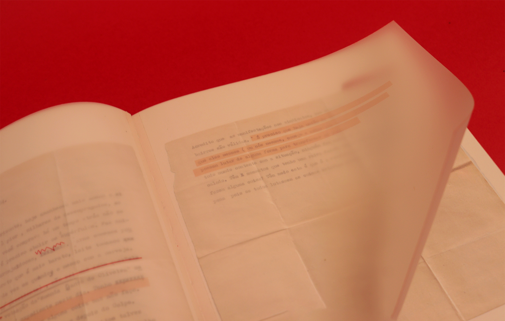 Through pages with translucent material and red ink, is the handwriting of my parents, of my brother and my own reflections about those memories.